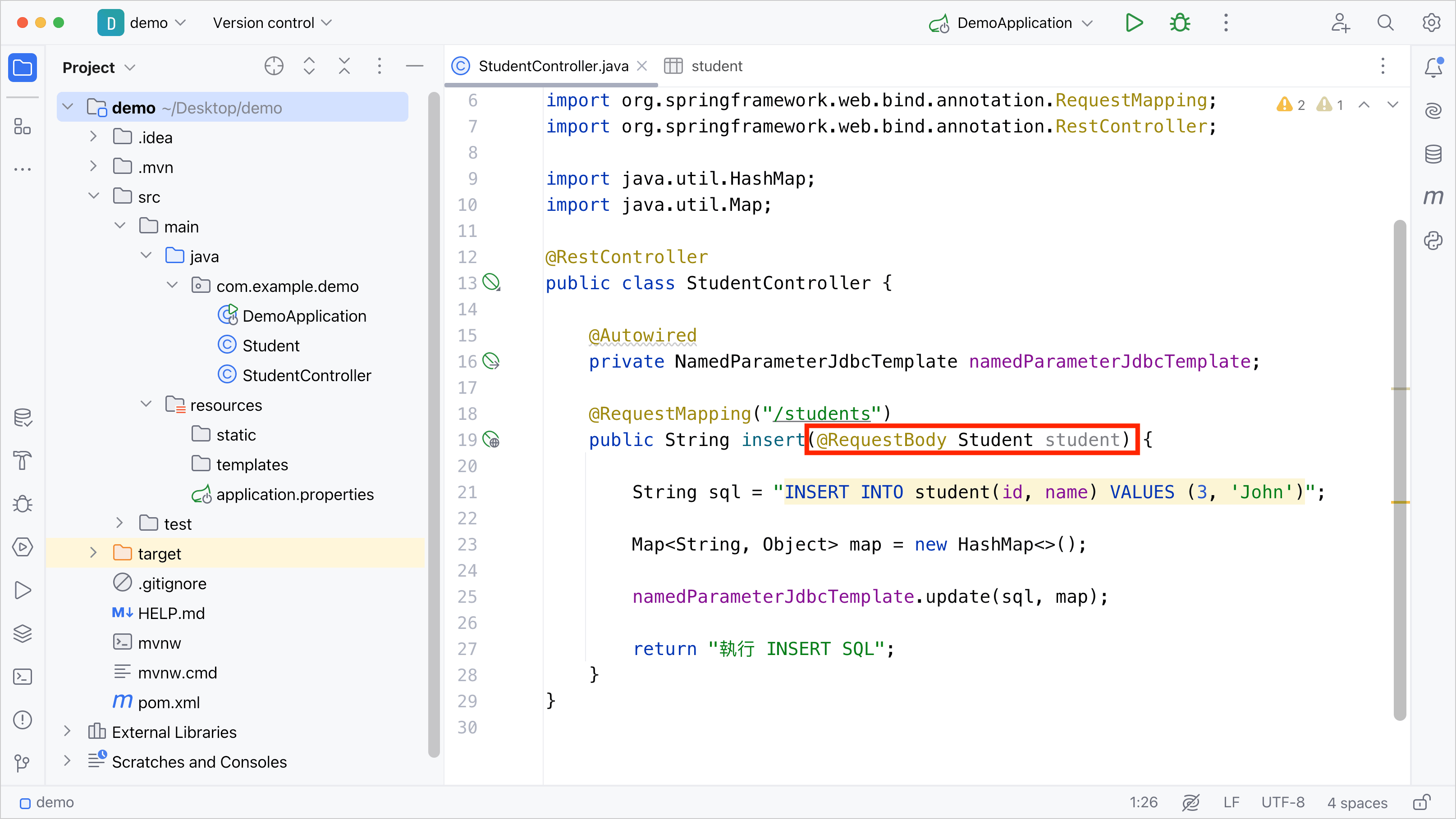 接著在 StudentController 裡,在第 19 行的 insert() 方法的實作中,添加 @RequestBody 註解,後續就可以使用 @RequestBody 去接住前端傳過來的參數。
